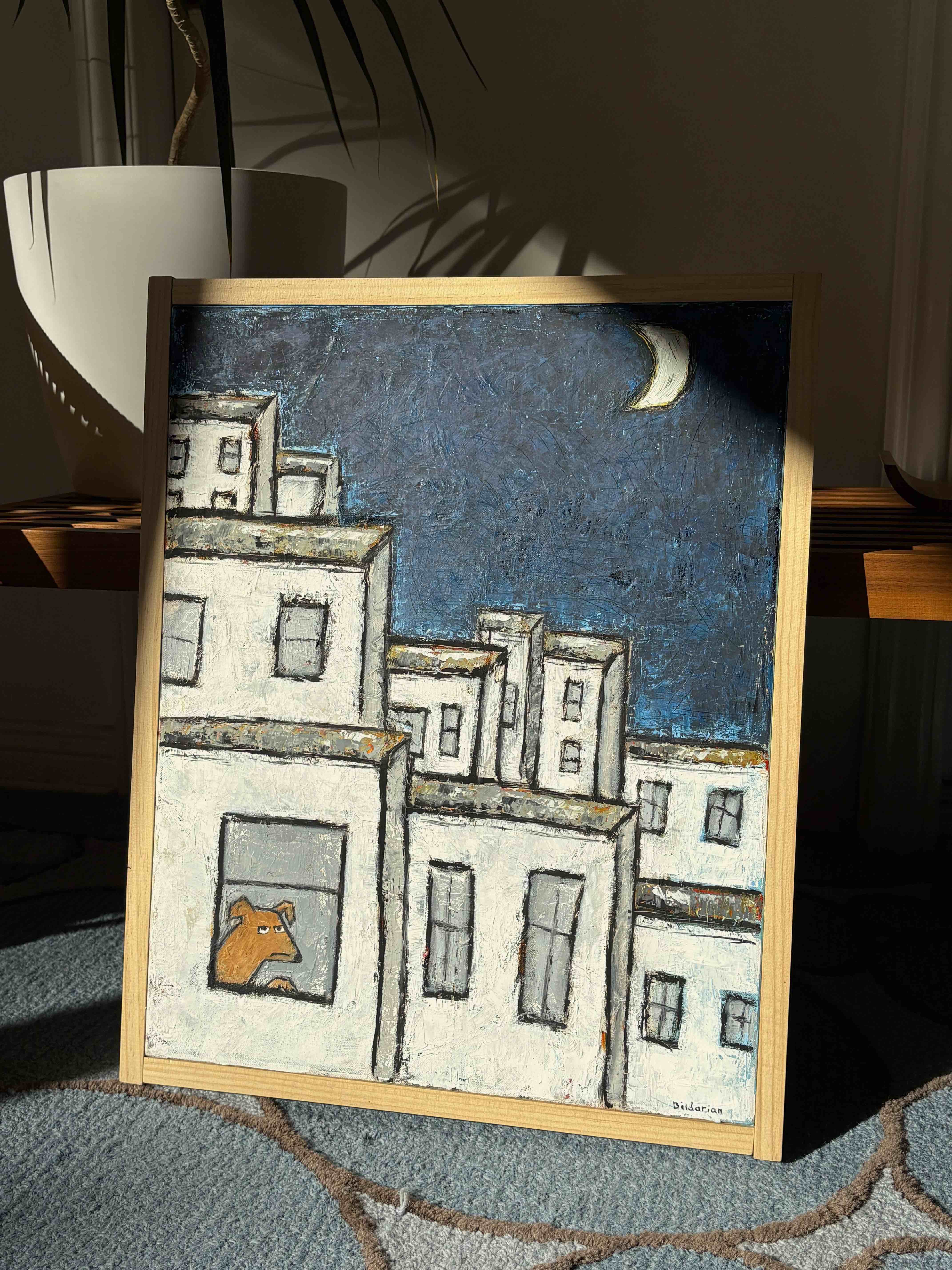 Dog in Window #17, oil on canvas, 16 x 20.” Hand framed with 3/4″ poplar and matte varnish. $1500 AVAILABLE